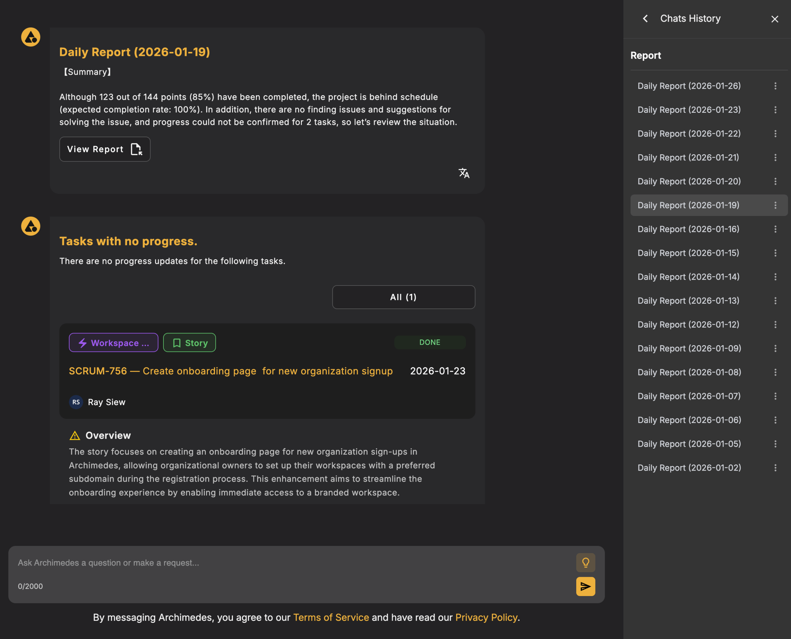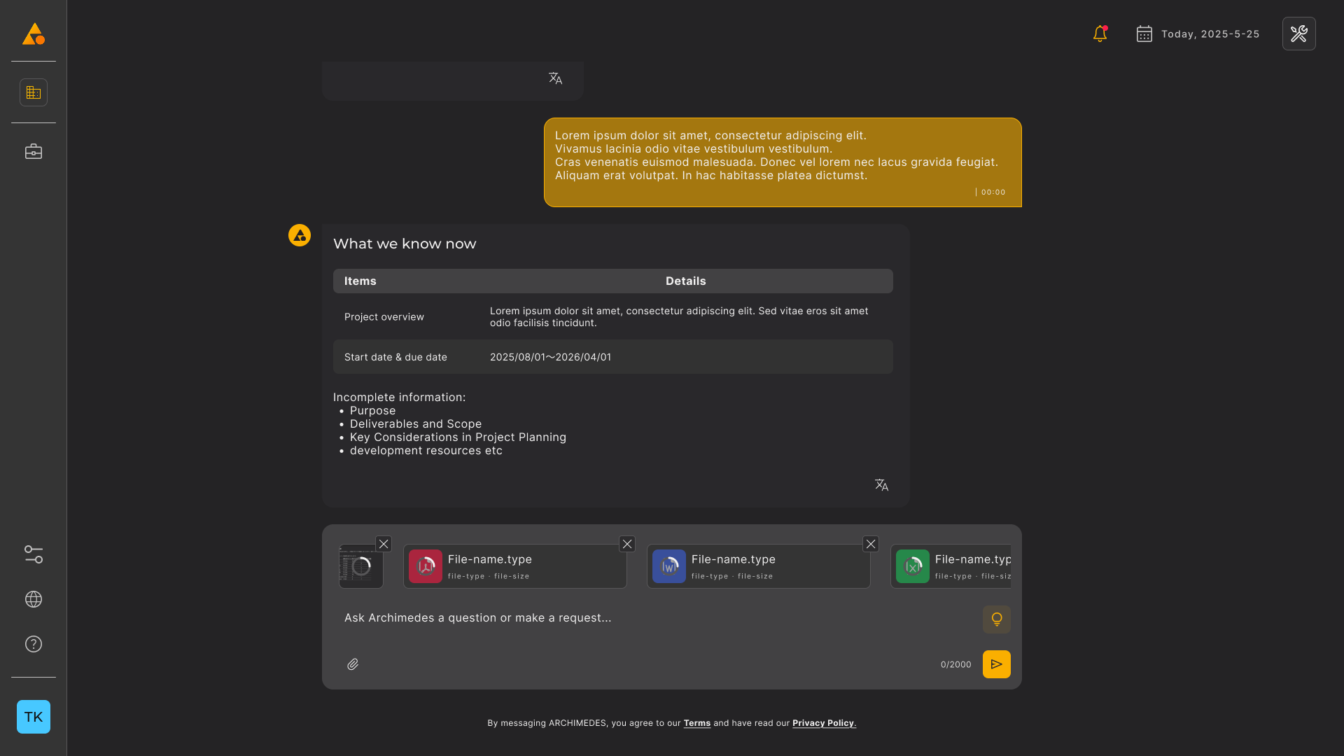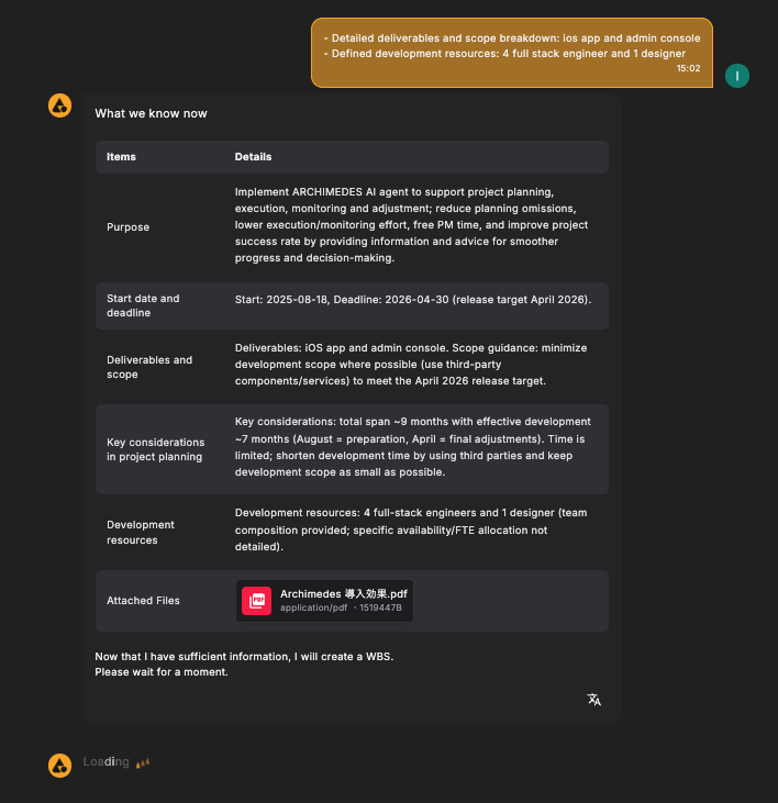 Ask anything about your project. ARCHIMEDES reads your documents, tasks, and conversation to give you a clear, actionable view of what’s happening now.